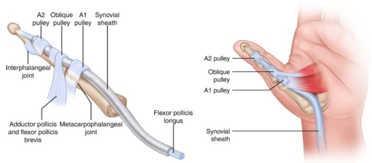 손가락을 구부리게 해주는 근육의 힘줄에 염증이 생겨서 발생함